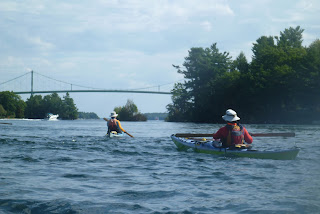 Next, we ran into the biggest challenge of paddling in this area - the fact that an international border runs through it. The rule is that you can cross the border as much as you want on water, but as soon as you set foot on land after crossing the border you have to check in with the appropriate border patrol agency. Heart Island is in the U.S. and there is a U.S. Customs and Border Patrol booth there to log in visitors coming from Canada in accordance with this rule. After finishing lunch we headed for the entry and dutifully logged in with CBP. The CBP officer gave us each a slip of paper with our U.S. entry number and a number to call upon our return to Canada. Suzanne and I, who are the ones to worry about such things, were concerned about what the re-entry check-in into Canada would entail (for example, would they expect us to physically visit an office outside of kayaking range?) so we decided to call the Canadian re-entry phone # right away. The Canadian officer on the other end of the line assured us that we could check in by phone upon our return.